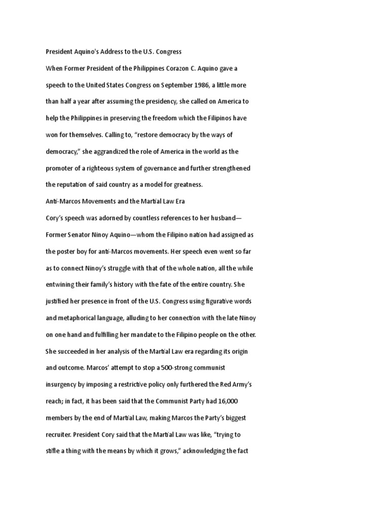 Aquino president of the philippines during the joint session of the united states congress delivered at washington, d.c., on september 18, 1986 three years ago, i left america in grief to bury my husband, ninoy aquino. Aquino president of the philippines during the joint session of the united states congress delivered at washington, d.c., on september 18, 1986 three years ago, i left america in grief to bury my husband, ninoy aquino. President aquino's address to the u.s. Speech of her excellency president corazon c. In 1983, ferdinand marcos's philippines was a place rife with rumour, conspiracy and intrigue.